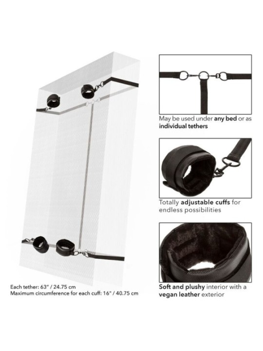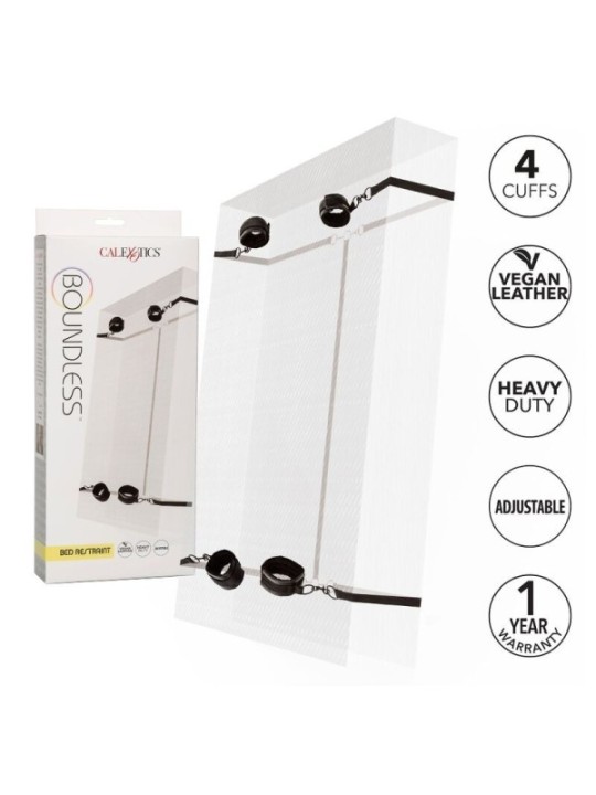 Attention : le système de retenue de lit Boundless risque d'encombrer vos soirées pendant longtemps ! Ce jouet pour adulte est livré avec des poignets et des chevilles dotés de fermetures de style velcro et de fermoirs universels, garantissant un maximum de confort et de retenue. Les sangles de fixation très robustes et réglables s'enroulent sous presque toutes les tailles de matelas, garantissant que le soumis est lié à la volonté du dominateur. En tant que catégorie de produits de jouets pour adultes en pleine croissance, les jouets sexuels BDSM ont connu un essor dans la communauté des produits de plaisir, libérant les gens de leurs tensions refoulées de la manière la plus sexuelle possible. Informations supplémentaires 4 poignets ou chevilles totalement réglables et détachables | 4 attaches robustes et réglables pour s'adapter à la plupart des matelas | Peut être utilisé sous n'importe quel lit ou comme attaches individuelles | Fermoirs universels et joints toriques avec conception pivotante pour une dextérité totale | Intérieur doux et moelleux avec un extérieur en cuir végétalien | Double rembourrage, double couture | Design fonctionnel, durable et texturé Dimension du produit Chaque attache : 160 cm | Circonférence maximale – chaque brassard : 40,75 cm Bodysafe Oui Matériau PU (tissu) | Polyester (doublure, décor ruban, Velcro, sangles) | Fer sans nickel (joints toriques, rivets) | Alliage de zinc sans nickel (fermoirs pivotants) | POM (ajusteurs)