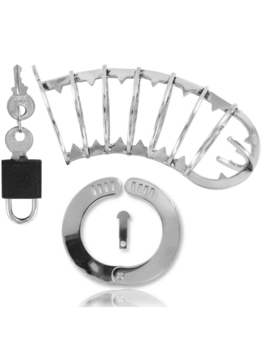 Que veut réaliser un homme qui a tout ? Cette cage bien sûr. Cet objet polyvalent offre le meilleur des deux mondes, il est fabriqué en acier inoxydable et est bien plus qu'une cage de chasteté. Il est conçu avec sept anneaux et quatre pointes au niveau du gland. L'anneau inclus est réglable style menottes grâce à son cadenas. Dimensions : 14 cm de longueur Diamètre : 3,5 cm Cadenas et clés inclus