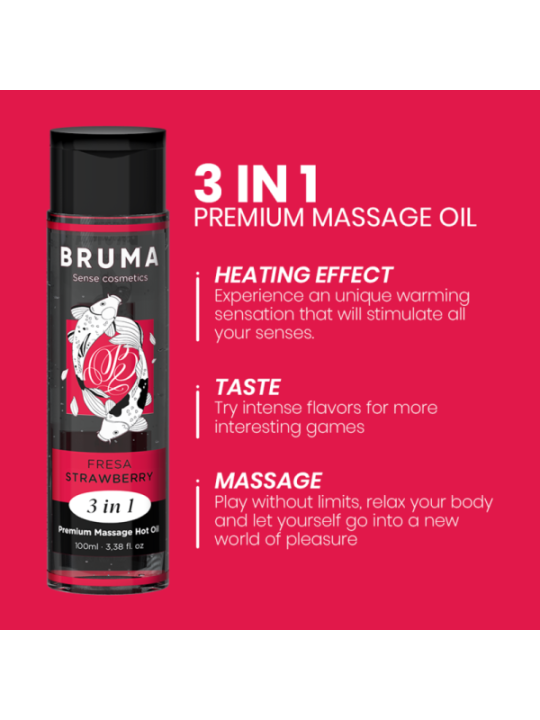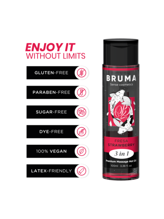 L'Huile de Massage Premium Effet Chaleur saveur fraise de la marque BRUMA est une véritable pépite dans l'univers du bien-être et de l'intimité. Ce produit exquis, présenté dans un élégant récipient de 100 ml, est conçu pour offrir une expérience unique et sensuelle, en offrant un massage relaxant et stimulant avec une touche de chaleur qui le rend encore plus spécial. Voici les faits saillants développés en détail : Effet Chaleur Apaisant : L'Huile de Massage BRUMA est un véritable soin de relaxation. Sa formule unique réchauffe doucement au contact de la peau, créant une sensation de chaleur qui aide à soulager les tensions et le stress accumulés dans les muscles. Cet effet thermique est parfait pour un massage intime ou relaxant. 3 en 1 : Polyvalence à chaque goutte : Cette huile n'est pas seulement une huile de massage ; C'est un produit polyvalent et multifonctionnel. Elle peut être utilisée comme huile de massage, lubrifiant intime et comme huile corporelle pour garder la peau douce et hydratée. Cela en fait une option complète pour améliorer l'intimité et le bien-être. Saveurs délicieuses : BRUMA propose une gamme de saveurs délicieuses dans ses différentes versions, permettant aux couples d'explorer et de vivre des expériences uniques. Des parfums exotiques aux saveurs rafraîchissantes, cette huile ajoute une touche sensorielle supplémentaire à l'expérience. Ingrédients de qualité : Cette huile est formulée avec des ingrédients de haute qualité. Il est totalement exempt de gluten, de parabènes, de sucre et de colorants, ce qui en fait un choix sûr pour tous les types de peau, même les plus sensibles. Végétalien et sans cruauté : BRUMA est fière d'être une marque 100 % végétalienne et sans cruauté envers les animaux. Aucun ingrédient d'origine animale n'est utilisé et aucun test sur les animaux n'est effectué à aucun moment de la production. Compatibilité latex : Il est important de noter que cette huile de massage est compatible avec les préservatifs en latex, ce qui la rend idéale pour les couples qui souhaitent maintenir des pratiques sûres et profiter de l'intimité sans soucis.En résumé, l'huile de massage à effet thermique BRUMA Premium est un produit de haute qualité qui allie luxe, sécurité et polyvalence. Avec son effet thermique relaxant, sa variété de saveurs et son engagement envers la santé et la durabilité, cette huile de massage est le choix parfait pour les couples qui cherchent à élever leur expérience intime et à se détendre au maximum.