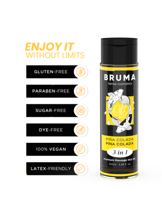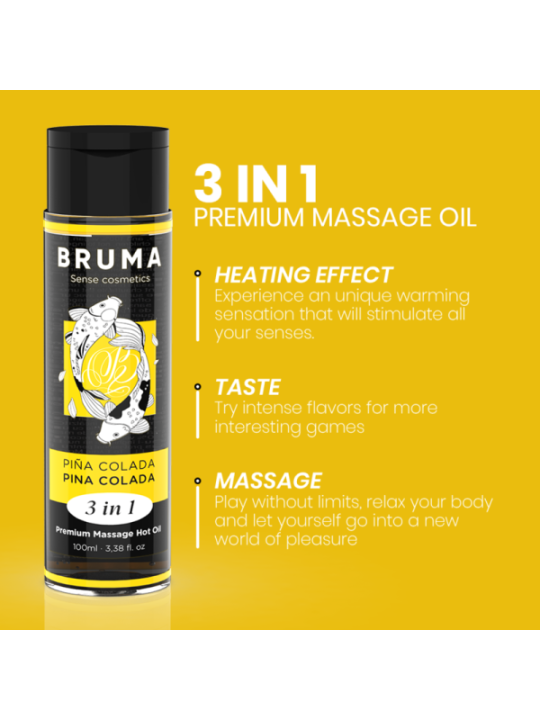 L'Huile de Massage Premium Effet Chaleur au goût Pina Colada de la marque BRUMA est une véritable pépite dans l'univers du bien-être et de l'intimité. Ce produit exquis, présenté dans un élégant récipient de 100 ml, est conçu pour offrir une expérience unique et sensuelle, en offrant un massage relaxant et stimulant avec une touche de chaleur qui le rend encore plus spécial. Voici les faits saillants développés en détail : Effet Chaleur Apaisant : L'Huile de Massage BRUMA est un véritable soin de relaxation. Sa formule unique réchauffe doucement au contact de la peau, créant une sensation de chaleur qui aide à soulager les tensions et le stress accumulés dans les muscles. Cet effet thermique est parfait pour un massage intime ou relaxant. 3 en 1 : Polyvalence à chaque goutte : Cette huile n'est pas seulement une huile de massage ; C'est un produit polyvalent et multifonctionnel. Elle peut être utilisée comme huile de massage, lubrifiant intime et comme huile corporelle pour garder la peau douce et hydratée. Cela en fait une option complète pour améliorer l'intimité et le bien-être. Saveurs délicieuses : BRUMA propose une gamme de saveurs délicieuses dans ses différentes versions, permettant aux couples d'explorer et de vivre des expériences uniques. Des parfums exotiques aux saveurs rafraîchissantes, cette huile ajoute une touche sensorielle supplémentaire à l'expérience. Ingrédients de qualité : Cette huile est formulée avec des ingrédients de haute qualité. Il est totalement exempt de gluten, de parabènes, de sucre et de colorants, ce qui en fait un choix sûr pour tous les types de peau, même les plus sensibles. Végétalien et sans cruauté : BRUMA est fière d'être une marque 100 % végétalienne et sans cruauté envers les animaux. Aucun ingrédient d'origine animale n'est utilisé et aucun test sur les animaux n'est effectué à aucun moment de la production. Compatibilité latex : Il est important de noter que cette huile de massage est compatible avec les préservatifs en latex, ce qui la rend idéale pour les couples qui souhaitent maintenir des pratiques sûres et profiter de l'intimité sans soucis.En résumé, l'huile de massage à effet thermique BRUMA Premium est un produit de haute qualité qui allie luxe, sécurité et polyvalence. Avec son effet thermique relaxant, sa variété de saveurs et son engagement envers la santé et la durabilité, cette huile de massage est le choix parfait pour les couples qui cherchent à élever leur expérience intime et à se détendre au maximum.
