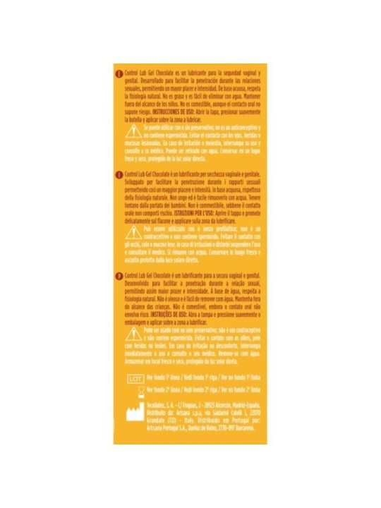 Control Lub Gel Chocolat est un lubrifiant pour la sécheresse vaginale et génitale avec un agréable effet chauffant développé pour faciliter la pénétration lors des relations sexuelles, permettant plus de plaisir et d'intensité. A base d'eau, respecte la physiologie naturelle. Il n'est pas gras et s'enlève facilement avec de l'eau Gel Lubrifiant Control Chocolat à base d'eau Non comestible bien qu'il ne présente pas de risque de contact oral Peut être utilisé avec ou sans préservatif Sans parabènes. Quantité : 75 ml