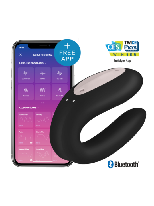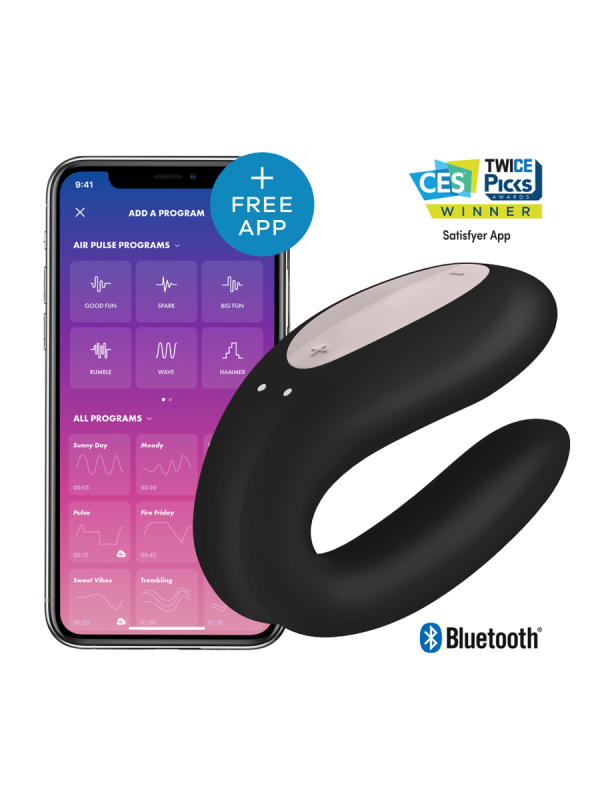 SATISFYER 'DOUBLE JOIE'Séduction, variété et passion : pour que votre vraie vie amoureuse soit toujours au rendez-vous. trônant sur le nuage 7, un vent frais peut-il murmurer ici ? et là à travers les draps ? Les orgasmes ordinaires d'une classe à part ne sont certainement pas une mauvaise idée : avec le vibromasseur pour couples Double Joy en silicone médical, qui peut être contrôlé par l'application, votre moment sexuel devient encore plus intense en stimulant un stimulus supplémentaire. Avec son design ergonomique et flexible, il s'assoit avec élégance et apporte un peu de magie supplémentaire sur simple pression d'un bouton.2 MOTEURS POUR UN DOUBLE BONHEURDouble Joy garantit des moments inoubliables et partagés : pendant les rapports sexuels, le vibromasseur en forme de U s'insère simplement pour que les deux parties puissent profiter des vibrations intenses. Tandis qu'une tige stimule votre clitoris de l'extérieur, l'autre côté du jouet assure une tension séduisante au sein de son sceau d'amour. Les deux extrémités vibrent avec la même puissance grâce aux deux moteurs. La tige interne stimule à la fois votre point G et votre meilleure pièce lorsque vous l'allumez et l'éteignez. Grâce au contrôle pratique de l'application, vous pouvez changer de programme confortablement, même dans les moments d'extrême extase.DONNEZ-LUI LE POUVOIR !Votre jouet est équipé de piles intégrées et est donc rechargeable de manière écologique. Si nécessaire, le câble de chargement magnétique USB fourni peut être complété par une prise secteur standard de 5 V.MATéRIEL ET ENTRETIENIl est résistant à l'eau. Fabriqué en silicone médical soyeux, extrêmement facile à glisser et absorbe rapidement la chaleur corporelle. Le jouet peut être facilement nettoyé avec un peu de savon sous l'eau tiède. Avec un peu de nettoyant désinfectant pour jouets, vous pouvez ensuite assurer une hygiène particulièrement soignée, idéalement avec le spray désinfectant parfaitement coordonné de Satisfyer. Pour un maximum de plaisir, utilisez toujours votre jouet avec l'un des lubrifiants à base d'eau de Satisfyer parfaitement assortis au produit.Ils se déclinent en versions classiques, soyeuses et chaleureuses. La composition végétalienne à base d'eau protège le matériau et garde la surface de votre jouet agréable et lisse.LA MARQUE SATISFAISANTESatisfyer : bien plus qu'une marque allemande ! Tout a commencé par une stimulation sans contact du clitoris grâce à une technologie innovante et brevetée d'ondes de pression. Pendant ce temps, la marque leader mondial de bien-être sexuel enrichit la vie amoureuse de plus de 25 000 000 millions de femmes, d'hommes et de couples dans plus de 100 pays avec une large gamme de produits et de produits de beauté. Comme toujours, des idées nouvelles et les plus modernes. Des technologies avec des caractéristiques de qualité telles qu'un silicone de haute qualité, une garantie de 15 ans, une fabrication hermétique et des moteurs puissants, la marque allemande à succès est toujours là. désireux de combiner la technologie avec un design exceptionnel dans ses produits. Au cours des trois dernières années seulement, Satisfyer a remporté plus de 140 prix internationaux de design comme aucune autre entreprise.