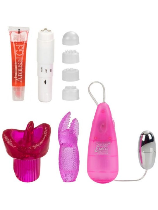 Kit Conçu pour les femmes audacieuses qui disposent d'un kit complet pour leurs moments les plus intimes. C'est un stimulateur puissant avec différentes vitesses. Il dispose d'un masseur compact avec quatre points de plaisir uniques. Utilisez le gel d'excitation pour un maximum de plaisir et utilisez le manchon lapin, doux et élastique, pour obtenir l'orgasme le plus intense. Sans danger pour votre corps, sans odeur et sans phtalates. Comprend : un masseur compact, un stimulateur ergonomique à plusieurs vitesses, un gel excitant et deux housses avec effet langue et tête de lapin. Découvrez California Exotics, à la pointe de la sexualité !