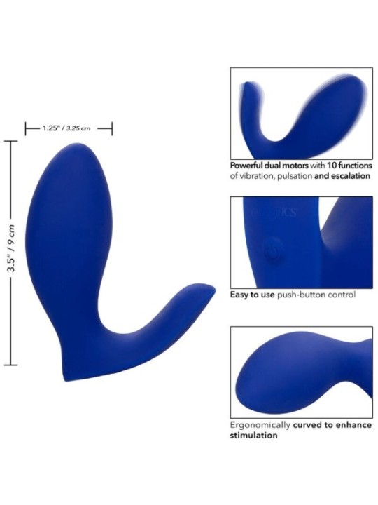 Surfez sur les vagues d'extase vers des territoires de plaisir inexplorés avec la sonde Admiral Prostate Rimming.La sonde à 10 fonctions allie confort flexible et stimulation intense avec un design ferme mais flexible et deux moteurs puissants. Deux puissants moteurs de vibration alignent l'arbre pour offrir une stimulation grondante de porte à porte à l'arrière, tandis que la base profilée et le corps flexible se plient et bougent pendant la plupart des moments X.Profitez d'une insertion confortable, d'une stimulation sans effort et d'un retrait en douceur grâce à la forme ergonomique douce, au design flexible et à la base incurvée. Rechargez le masseur en silicone Premium en 2,5 heures avec le câble de chargement USB inclus pour profiter de 30 minutes de stimulation à haute vitesse ou de 90 minutes de vibrations à basse vitesse. Tandis que le bouton facile contrôle l'intensité et que la sonde potelée vous donne la stimulation que vous souhaitez, la puce mémoire intégrée de dernière génération se souvient de la façon dont vous l'aimez en commençant par la dernière fonction utilisée. CARACTéRISTIQUES: Dimensions du produit : 9 x 3,3 cm Longueur totale : 9 cm Diamètre : 3,3 cm Longueur insérable : 9 cm Vibrant : Oui Résistance à l'eau : étanche Matériel : Silicone Moteurs : 2 Rechargeable : Oui Temps de fonctionnement en minutes : 90 Temps de charge en minutes : 150CalExotics transforme progressivement « le fantasme en réalité » depuis plus d’une décennie. Avec une attention inégalée aux détails, la fondatrice et propriétaire de CalExotics, Susan Colvin, a fait de la marque California Exotic Nouveauté synonyme de jouets pour adultes de qualité. Le fait que CalExotics soit une entreprise détenue et exploitée par des femmes joue un rôle majeur dans son ascension fulgurante au sommet de l'industrie des jouets et des nouveautés pour adultes. .