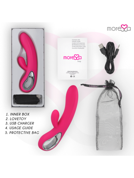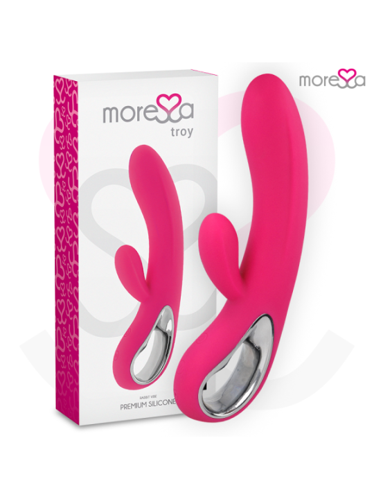 Troie est un plaisir interne ou externe. Plaisir INTENSE de la stimulation du point G et du clitoris avec l'exquis vibrateur double action. Actuel et soigné dans les moindres détails, il s'adapte au corps féminin tout en activant deux moteurs internes silencieux et puissants qui garantissent des orgasmes galactiques. Puissant; 12 modes de vibration exclusifs activés par 2 moteurs rechargeables. Fabriqué en silicone de haute qualité, le corps est ferme et confortable. Troy transfère le plaisir grâce à sa taille parfaite simultanément vaginale et clitoridienne. Luxe; Finition parfaite avec support ABSDe la pointe à sa base il s'adapte naturellement à la température de votre corps.Troy réécrit l'histoire des lapins vibrants. 100% silicone médical Imperméable 12 modes de vibrations 2 Moteurs puissants et silencieux. Matériau sans danger pour le corps Sans phtalates Mesure totale ; 200x36mm Poids; 154 grammes Rechargeable par USB (câble inclus) Ergonomique Commande rétroéclairée avec lumières LED stimulation clitoridienneFonctionnement/UtilisationPour allumer le vibreur, appuyez sur la touche bouton d'alimentation pendant environ 3 secondes et un voyant rouge s'allumera. Appuyez ensuite sur la touche inférieure et répétez pour parcourir les 12 modes de vibration de luxe. Une fois que Troy a terminé, appuyez sur le bouton pendant deux secondes et il s'éteindra.PorterLe vibromasseur est rechargeable et permet une manipulation confortable, sans câbles gênants. Avant de l'utiliser pour la première fois, vous devez le charger complètement. Utilisez le câble de chargement USB inclus pour ce faire.Insérez la fiche du câble USB dans le trou de connexion de charge. Branchez-le sur l'alimentation avec un connecteur ou sur l'ordinateur via USB. Attention : le premier processus de charge peut prendre jusqu'à huit heures. éliminationL'élimination des appareils électroniques doit être effectuée conformément à la réglementation sur les déchets dangereux en vigueur dans l'Union européenne et les autres pays européens ou selon les réglementations locales. Respecter les règles d'élimination des déchetsSpécifique à votre pays et en cas de doute, renseignez-vous auprès de votre revendeur sur les options d'élimination. Contenu L'ouverture d'une boîte de produits MORESSA est une exclusivité. La satisfaction est notre objectif, c'est pourquoi nous avons soigné chaque détail. Troie Chargeur Manuel de l'UtilisateurMoressa est la marque de référence pour son design, sa qualité et sa technologie. Nous avons développé un produit innovant et pris soin de chaque processus de fabrication pour obtenir le meilleur résultat. Moressa est un symbole d'énergie, de force et de garantie. Acheter un Sextoy Moressa, c'est se sentir reflété dans l'actualité du jour. Chaque Moressa Toy vous transportera vers des sensations différentes. Un résultat inégalé grâce au silicone Premium confortable et aux designs ergonomiques.