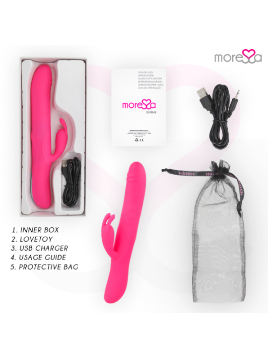 IMPRESSIONNANTE, forte et impressionnante : la structure de SOMER dorlote intensément le point G, le clitoris et chacune des zones érogènes les plus cachées.Tout ce que vous voulez dans un seul jouet ! Vibration, stimulation clitoridienne, pénétration intense avec système Rotation. Idéal à utiliser seul ou accompagné, Somer est élégant avec un toucher doux et soyeux. Son système Rotation est un système de rotations multiples utilisant des billes internes qui stimulent intensément la paroi vaginale. Ouvrez les portes d'un nouvel univers de plaisir avec SOMER, un jouet qui roule, tremble, vibre et vous offre ce dont vous avez toujours besoin. Vibromasseur clitoridien lapin PUISSANT et rampant, criez de plaisir quand vous le sentez ! Parcourez 7 modes de vibration + 4 fonctions de rotation multiples Enveloppé de silicone hypoallergénique et velouté, l'un des meilleurs matériaux, l'ensemble du vibromasseur de sa pointe à sa base s'adapte rapidement et naturellement à la température de votre corps.Warren est prêt à tout ce dont vous avez besoin ! Juste parfait! 100% silicone médical Matériau sans danger pour le corps Imperméable 7 modes de vibrations Fonction de rotation multiple à 4 modes. Ils font tourner leurs billes internes et font tourner leur arbre en même temps. Sans phtalates Mesure totale ; 28x3.5cm Longueur insérable : 16 cm Poids; 225 grammes Rechargeable par USB (câble inclus) Ergonomique Commande rétroéclairée avec lumières LED stimulation clitoridienneFonctionnement/Utilisation.Appuyez sur la touche pour activer Somer, puis appuyez sur la touche qui activera les impulsions, modifier les modes impulsions en appuyant sur la même touche . Continuez à appuyer sur la touche et activera la vibration du stimulateur Rabbit, puis appuyer sur la même touche et modifiera les modes de vibration. Une fois que Somer a fini, appuyez sur la touche éteint pendant 3 secondes.Porter Le vibromasseur est rechargeable et permet une manipulation confortable, sans câbles gênants. Avant de l'utiliser pour la première fois, vous devez le charger complètement. Utilisez le câble de chargement USB inclus pour ce faire.Insérez la fiche du câble USB dans le trou de connexion de charge. Branchez-le sur l'alimentation avec un connecteur ou sur l'ordinateur via USB. élimination L'élimination des appareils électroniques doit être effectuée conformément à la réglementation sur les déchets dangereux en vigueur dans l'Union européenne et les autres pays européens ou selon les réglementations locales. Veuillez respecter les réglementations spécifiques en matière d'élimination des déchets de votre pays et, en cas de doute, renseignez-vous auprès de votre revendeur sur les options d'élimination. Contenu L'ouverture d'une boîte de produits MORESSA est une exclusivité. La satisfaction est notre objectif, c'est pourquoi nous avons soigné chaque détail. quelqu'un Chargeur Sachet Manuel de l'UtilisateurMoressa est la marque de référence pour son design, sa qualité et sa technologie. Nous avons développé un produit innovant et pris soin de chaque processus de fabrication pour obtenir le meilleur résultat. Moressa est un symbole d'énergie, de force et de garantie. Acheter un Sextoy Moressa, c'est se sentir reflété dans l'actualité du jour. Chaque Moressa Toy vous transportera vers des sensations différentes. Un résultat inégalé grâce au silicone Premium confortable et aux designs ergonomiques.