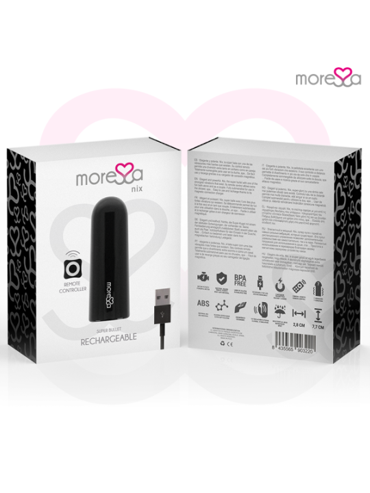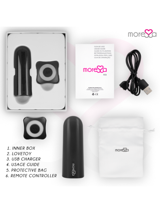 Nix est un vibromasseur télécommandé qui stimule tous vos sens : un objet élégant et simple, toujours prêt à vous plaire sans prévenir.Petit, léger, avec son aspect stimulateur séduisant, Nix est un vibromasseur discret et moderne à emporter toujours avec soi et à apprécier à tout moment.Et comme d'habitude avec MORESSA, la forme et la fonction s'unissent pour permettre un contrôle maximal dans ses quatre modes de stimulation différents. Comme tous les objets de plaisir MORESSA, Nix est conçu pour procurer une joie physique intense et une paix spirituelle absolue en toute situation et en toutes circonstances.Fabriqué en silicone médical et ABS, approuvé par la FDA et sans phtalate, Ivy offre 1,5 heure de vibrations pratiquement silencieuses après un temps de charge de seulement 1 heure. Avec la télécommande pratique, vous pouvez contrôler confortablement les vibrations et décider qui peut prendre les décisions. Pour des aventures endiablées et des préliminaires passionnants, la femme peut également porter le vibromasseur dans sa culotte et laisser son partenaire l'exciter pendant 2 heures d'affilée. Afin que vous puissiez profiter longtemps de votre nouvel ami, il est recommandé d'utiliser un lubrifiant à base d'eau au toucher aquatique lors de vos jeux les plus humides. De cette façon, vous protégez le matériau et la surface reste soyeuse. Vous pouvez laver votre jouet très facilement avec de l'eau et du savon doux. Pour une hygiène plus approfondie, utilisez également un nettoyant désinfectant spécial pour sextoys comme le Waterfeel ou le nettoyant pour jouets Nina kikí. • Haute performance; 7 modes de vibrations • Entièrement rechargeable ; Plus de pouvoir • Fabriqué en silicone médical et ABS : respectez votre corps • Sans phtalates • Silencieux, moins de 60 décibels. • Matériau sans danger pour le corps • Rechargeable par USB magnétique avec chargeur inclus. • Catégorie IPX7 submersible / Convient pour la douche ou le Spa • Commande rétroéclairée avec lumières LED • Mesure totale ; 77x28mm • Poids; 57 grammes • Certificat; Approuvé par la FDA.Appuyez sur le bouton + pendant seulement deux secondes pour allumer ou éteindre Nix. Appuyez sur le bouton intensités pour modifier le mode et l'intensité.Porter Le vibromasseur est rechargeable et permet une manipulation confortable, sans câbles gênants avec un chargeur magnétique. Avant de l'utiliser pour la première fois, vous devez le charger complètement. Attention : le premier processus de charge peut prendre jusqu'à trois heures. éliminationL'élimination des appareils électroniques doit être effectuée conformément à la réglementation sur les déchets dangereux en vigueur dans l'Union européenne et les autres pays européens ou selon les réglementations locales. Respecter les règles d'élimination des déchetsSpécifique à votre pays et en cas de doute, renseignez-vous auprès de votre revendeur sur les options d'élimination. Contenu L'ouverture d'une boîte de produits MORESSA est une exclusivité. La satisfaction est notre objectif, c'est pourquoi nous avons soigné chaque détail. • Rien • Câble de chargeur magnétique • Télécommande • Sac pour le ranger après utilisation. • Manuel de l'UtilisateurMoressa est la marque de référence pour son design, sa qualité et sa technologie. Nous avons développé un produit innovant et pris soin de chaque processus de fabrication pour obtenir le meilleur résultat. Moressa est un symbole d'énergie, de force et de garantie. Acheter un Sextoy Moressa, c'est se sentir reflété dans l'actualité du jour. Chaque Moressa Toy vous transportera vers des sensations différentes. Un résultat inégalé grâce au silicone Premium confortable et aux designs ergonomiques.
