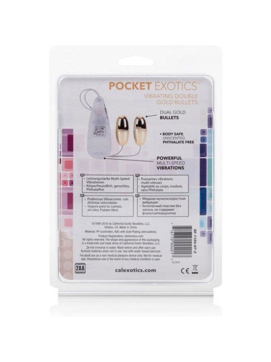 Les Pocket Exotics Vibrant Double Gold Bullets sont fabriquées en ABS. Ce qui les rend sûrs, sensuels et stimulants. Ces balles sensuelles ont tout ce dont vous avez besoin, le summum du plaisir sensuel. Le plaqué or offre une satisfaction à plusieurs vitesses. Durable et excitant, à déguster seul ou en couple. Laissez ces balles cibler le cœur du désir et vivez une aventure sensuelle vraiment excitante. Il intègre un vibrateur multi-vitesses qui fonctionne avec deux piles AA (non incluses) Dans la recherche continue du plaisir immédiat, California Exotics continue d'innover avec des milliers de produits pour le plaisir féminin et masculin. êtes-vous prêt à passer à l'action ?