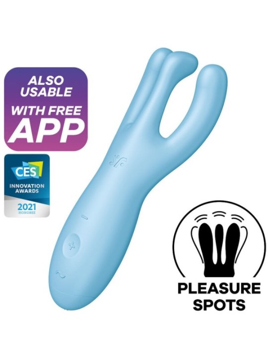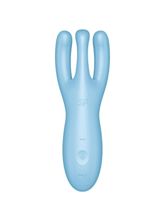Satisfyer Threesome 4 possède trois bras, un moteur puissant et un design innovant. C'est un vibrateur de contact qui stimule le clitoris et les lèvres. Informations sur le produit Satisfyer "Trio 4" Stimulation sensuelle du clitoris et des lèvres Bras flexibles pour une stimulation passionnée 12 programmes de vibrations 3 moteurs puissants et super puissants Compatible avec l'application gratuite Satisfyer – disponible pour iOS et Android Mode murmure Fabriqué en silicone médical super doux et doux pour la peau avec un toucher soyeux Garantie 15 ans Cal peut également être utilisé sans l'application L'application offre une gamme infinie de programmes Batterie Li-ion rechargeable étanche (IPX7) Câble de chargement USB magnétique inclus Facile à nettoyer Que peut vous offrir d'autre le vibromasseur Satisfyer Threesome 4 ? Le corps rigide possède des bras flexibles qui peuvent être ajustés pour stimuler les bons endroits. Threesome 4 dispose de trois moteurs qui offrent des vibrations puissantes et profondes à l'utilisateur. 2 x 12 programmes de vibrations offrent d'innombrables façons de stimuler le clitoris et les lèvres. Avec l'application gratuite Connect, vous pouvez contrôler le vibromasseur dans le monde entier via Internet, associer l'appareil à votre playlist préférée sur Spotify ou créer vos propres programmes de vibrations et les transférer sur votre Satisfyer – les possibilités sont infinies ! Les 12 programmes de vibration prédéfinis sur le vibrateur peuvent être contrôlés intuitivement via le bouton même sans l'application.