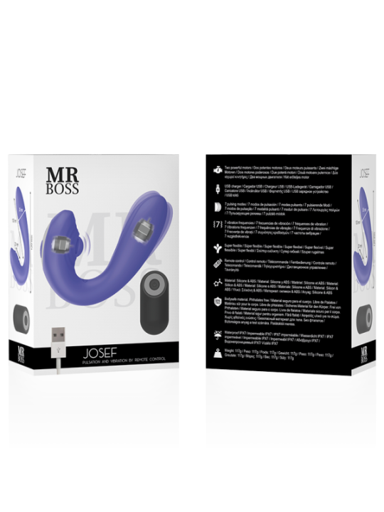 MR BOSS lance la nouvelle collection de vibrateurs et rotateurs dotés de moteurs de nouvelle génération, permettant une augmentation de la puissance avec une plus grande durabilité. Sa finition premium en silicone super doux est un plus pour les orgasmes les plus exigeants. Tous les vibromasseurs et rotateurs de la nouvelle collection MR BOSS se rechargent par USB, ils sont élégants et leur finition en silicone premium, super douce et hypoallergénique est un plus pour les orgasmes les plus exigeants.La gamme JOSEF PULSATION & VIBRATION intègre un vibromasseur double avec des pulsations sur le clitoris. Sa forme spéciale permet aux deux membres du couple d'être stimulés par des vibrations spectaculaires pendant les rapports sexuels. Deux moteurs puissants excitent le clitoris et le point G, permettant de stimuler la pénétration, rendant l'acte sexuel impressionnant.Traits: 7 modes de vibrations 7 modes de pulsations 2 moteurs super puissants Très flexible Télécommande 12,0 cm x 3,5 cm 117 grammes Rechargeable par USB IPX7 étanche Silicone ultra doux et ABS Matériau sans danger pour le corps Sans phtalate Lubrifiant neutre WATERFEEL gratuit 6 mlMR BOSS est une marque premium adaptée à tous les budgets, avec tous les standards de qualité des jouets érotiques moyen-haut de gamme. Les formes et les courbes de chaque vibromasseur MR BOSS sont formidables, parfaitement conçues pour procurer plaisir et plaisir.
