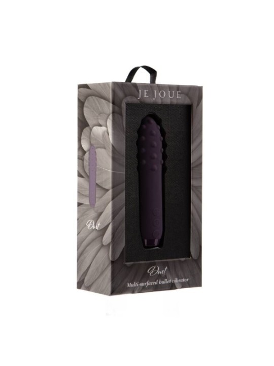 Découvrez Duet, un vibromasseur bullet multi-surfaces avec de petits points de plaisir arrondis et gradués d'un côté et une surface lisse et soyeuse de l'autre pour offrir de multiples sensations sur tout le corps. Utilisez Duet pour stimuler les points de plaisir externes tels que le clitoris, les mamelons et la cuisse. Et si vous souhaitez explorer davantage, Duet est le partenaire idéal pour un jeu de pénétration doux et peu profond grâce à ses vibrations profondément riches. Avec son silicone de qualité médicale, doux et soyeux, sans danger pour le corps, Duet est agréable au toucher et encore meilleur à expérimenter. Laissez les célèbres moteurs ronflants de Je Joue dorloter votre corps plus profondément, vous offrant une expérience intime plus riche et plus agréable.CARACTéRISTIQUES Vibromasseur bullet compact avec une pointe multi-surfaces 5 vitesses et 7 modes pour vous faire vibrer Silencieux pour jouer en privé ou parfait pour une utilisation avec un partenaire étanche pour s'amuser dans l'eau Entièrement rechargeable, branchez-le sur un port USB où que vous soyez Vibromasseur 100% Vegan Verrouillage de voyage – maintenez simplement + et – ensemble pour verrouiller et déverrouiller Comment il mesure Hauteur : 115 mm / 11,5 cm Largeur : 28,5 mm / 2,85 cm Profondeur : 28,5 mm / 2,85 cmCONSEILS CRéATIFSLa pointe multi-surfaces Duet signifie que vous pouvez utiliser les différentes surfaces pour explorer ce qui vous convient le mieux. Duet est également polyvalent et peut être utilisé à la fois pour un jeu externe et interne superficiel. ;Utilisez Duet pour explorer la vulve, en massant les lèvres et le clitoris pour susciter l'excitation et explorer ce qui vous convient le mieux. Faites pivoter la pointe de Duet dans le clitoris et continuez à explorer là où vous vous sentez bien. Essayez les différentes surfaces, arrondies et lisses ainsi que les intensités et choisissez ce qui vous fait du bien. Continuez à tourner et à ajouter de la pression là où vous ressentez des sensations, augmentant ainsi le plaisir et l'accumulation. Le moteur ronronnant de Duet libère des vibrations à basse fréquence qui pénétreront davantage dans le corps, donnant ainsi une sensation plus riche et plus profonde.Si vous souhaitez explorer des vibrations internes peu profondes, faites-le une fois excité ou utilisez un lubrifiant à base d'eau. L'exploration est la clé, la rotation et l'ajout de pression là où cela fait du bien. Pour ceux qui veulent être plus aventureux, vous pouvez explorer l'entrée de l'anus et le périnée, laissant les vibrations et les surfaces Duet vous exciter.En utilisant les 5 vitesses différentes et les 7 modèles, essayez différentes intensités, pressions et pulsations. Expérimentez ce qui fonctionne le mieux pour votre corps et allez-y.