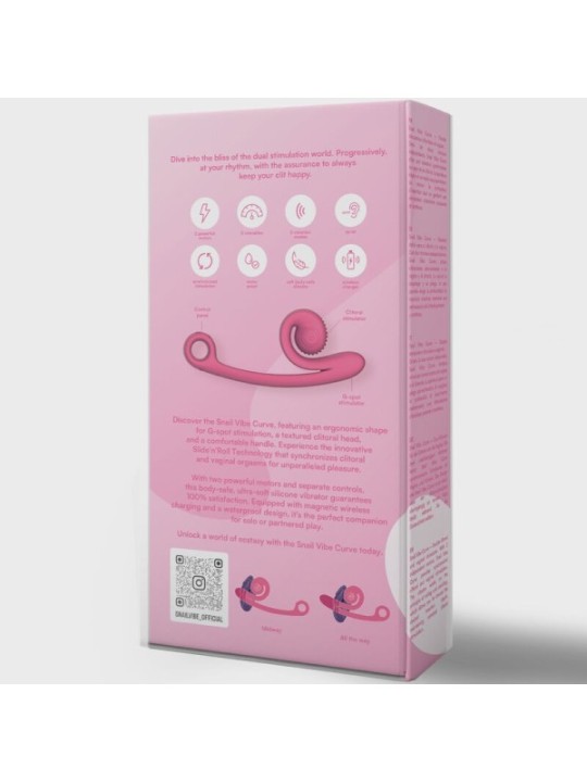 Découvrez le Snail Vibe Curve, doté d'une forme ergonomique pour la stimulation du point G, d'une tête clitoridienne texturée et d'un manche confortable. Découvrez la technologie innovante Slide'n'Roll qui synchronise les orgasmes clitoridiens et vaginaux pour un plaisir inégalé. Doté de deux moteurs puissants et de commandes séparées, ce vibromasseur en silicone ultra-doux et sans danger pour le corps garantit une satisfaction à 100 %. Équipé d'un chargement sans fil magnétique et d'une conception étanche, c'est le compagnon idéal pour jouer en solo ou en couple. Matériau : Silicone de qualité médicale sans danger pour le corps Moteurs : 2 moteurs indépendants Modes : 5 vitesses, 5 modes, plus de 600 combinaisons Commandes : Bouton poussoir Longueur insérable : 140 mm/5,5” à 35 mm/1,4” Largeur insérable : 35 mm/1,4” Son : rassurant et silencieux < 45 dB Utilisation : environ 1 heure selon le mode utilisé Chargement : magnétique sans fil, environ 2 heures pour une charge maximale Alimentation : batterie Li-ion rechargeable Inclus dans la boîte : Snail Vibe Curve, étui de protection, câble de chargement magnétique, manuel d'instructions Mode d'emploi : Livret multilingue GB, FR, DE, IT, ES, PT, RU.