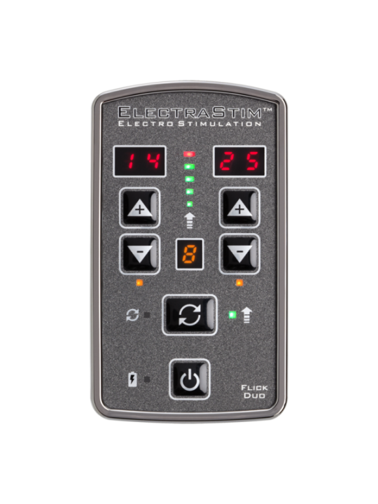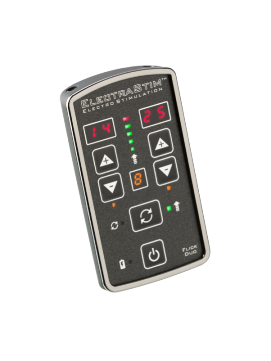 L'ElectraStim Flick Duo est la première machine électro sexuelle rechargeable au monde avec 2 canaux indépendants ! Idéal pour les couples et les joueurs puissants qui souhaitent utiliser plus de jouets en même temps, Flick Duo peut alimenter jusqu'à 4 électrodes unipolaires ou 2 électrodes bipolaires à la fois. Chaque canal est contrôlé indépendamment, vous donnant plus de contrôle sur les sensations que vous ressentez et améliorant la stimulation partagée avec votre partenaire. Avec 8 réglages de motifs et 4 réglages Flick activés par le mouvement pour explorer plus de 25 niveaux d'intensité, vous n'aurez que l'embarras du choix en explorant les charmes excitants de ce stimulateur innovant. De petite taille et très fonctionnel, vous adorerez l'apparence élégante de cet appareil d'électrostimulation intuitif. Nous avons inclus tout ce dont vous avez besoin pour commencer, y compris 4 de nos ElectraPads les plus vendus pour que vous soyez prêt à jouer directement depuis la boîte. Remarque : Pour vous assurer de choisir un stimulateur suffisamment puissant pour vos accessoires, nous vous recommandons toujours de consulter notre Ce qui est inclu? - 1 x Stimulateur ElectraStim Flick Duo EM80 - 4 x ElectraPads unipolaires - 2 x fils de connexion avec connecteurs à broches de 2 mm - 1 x câble de chargement - 1 x Pochette de rangement - Une garantie de 1 an, extensible à 3 ans lorsque vous enregistrez votre achat Caractéristiques du produit: - 4 x fonctionnalités brevetées (GB2499585) activées par le mouvement "Flick" - Deux canaux - alimente deux fois plus d'électrodes qu'un stimulateur monocanal - Contrôle d'intensité indépendant pour chaque canal - Rechargeable via USB – aucune pile requise - Jusqu'à 6 heures d'utilisation entre les charges - Indicateur de batterie faible - Facile à utiliser - parfait pour les débutants - Intensifie le plaisir lors de toutes les activités sexuelles - Idéal pour la masturbation, les préliminaires ou comme jouet sexuel en couple lors d'un rapport sexuel avec pénétration - 8 réglages de stimulation dont stimulation continue, pulsation et escalade - 25 niveaux d'intensité - Unité de commande soft-touch avec boutons poussoirs et affichage LED - Taille compacte et portable